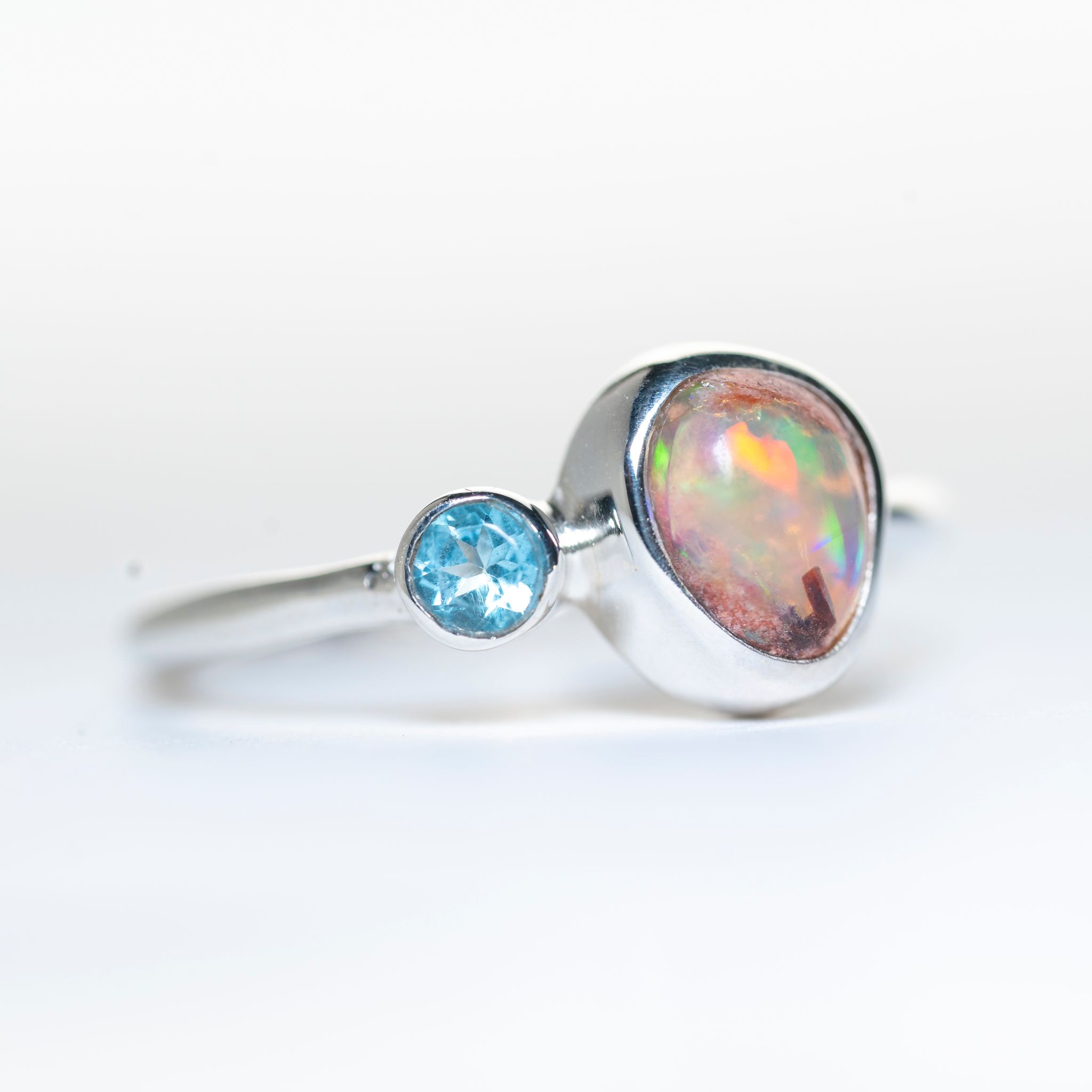 Anillo de plata 925 hecho a mano con Ópalo de Fuego mexicano y Topacio azul talla brillante.