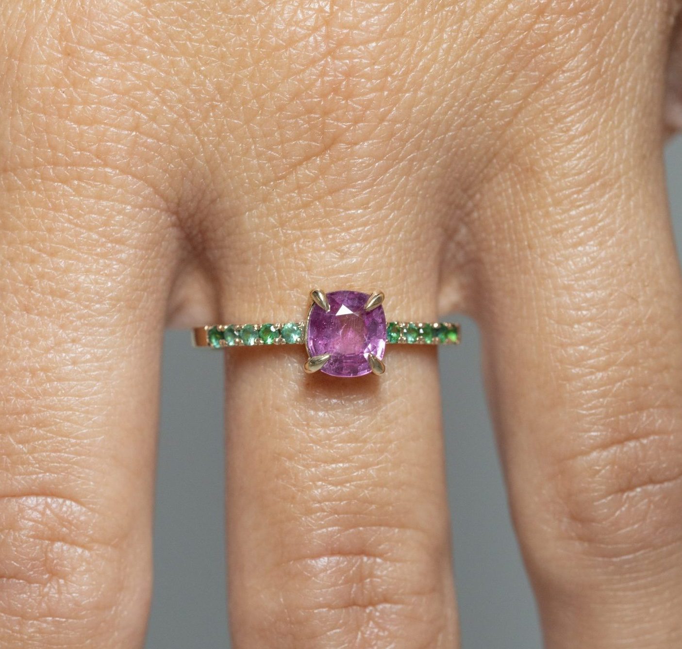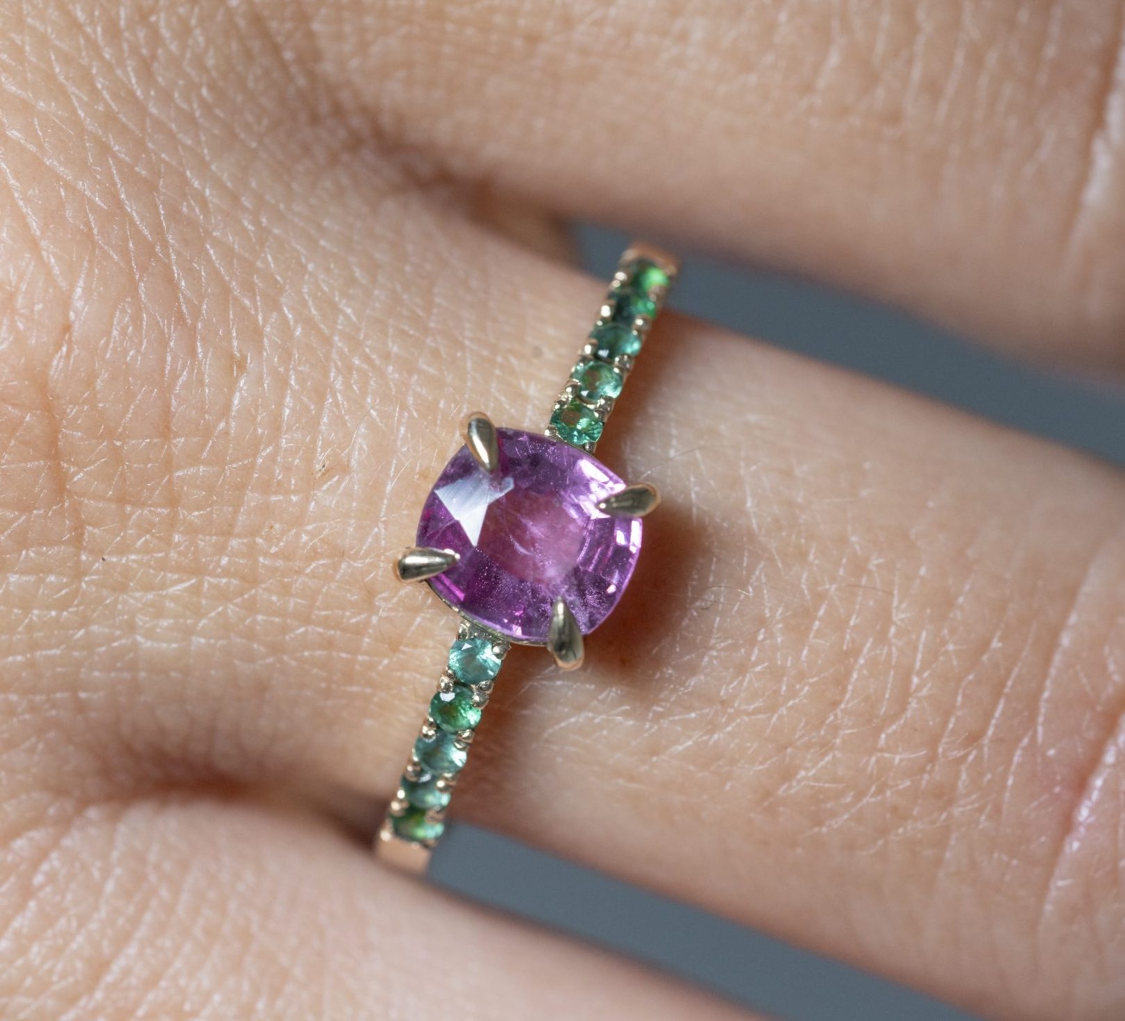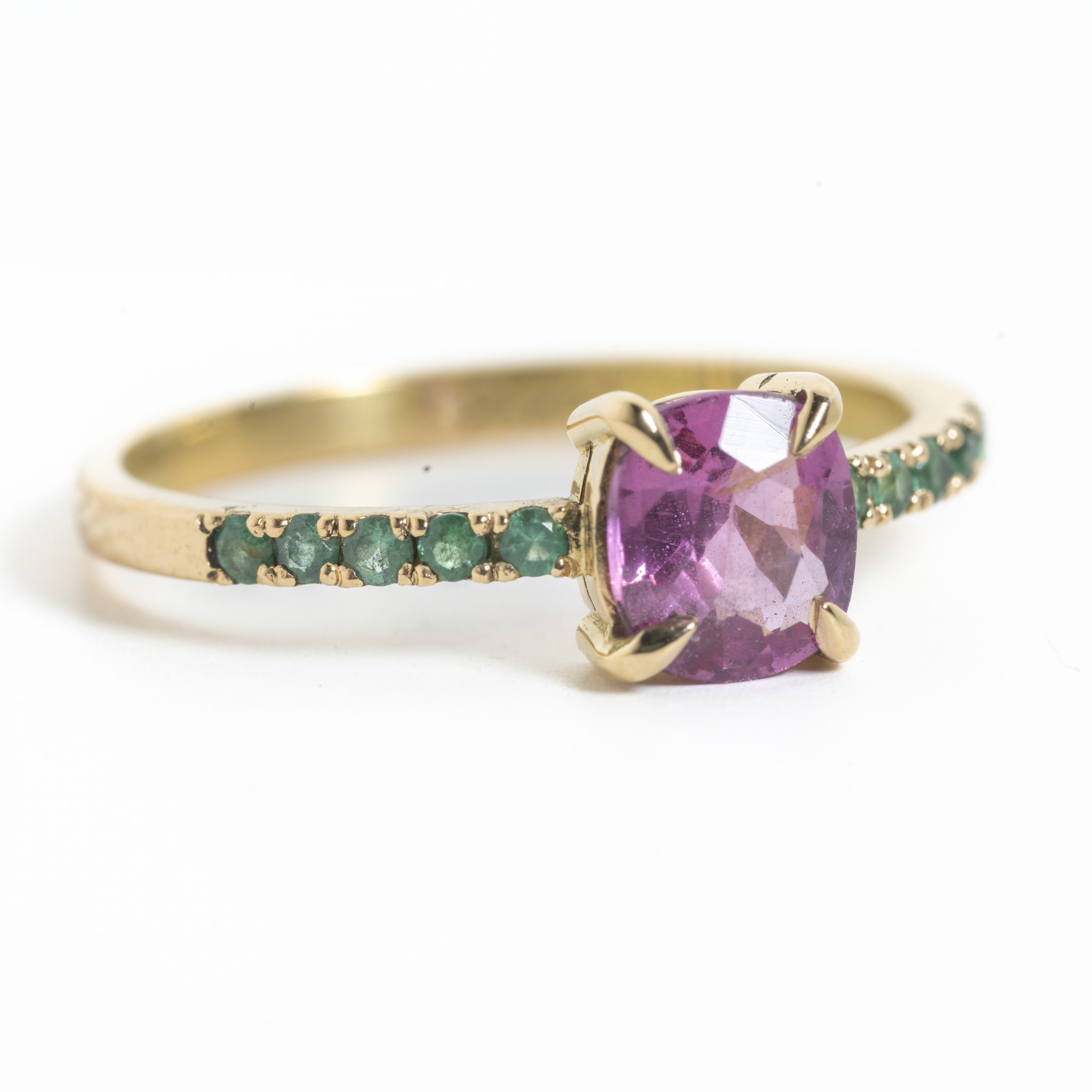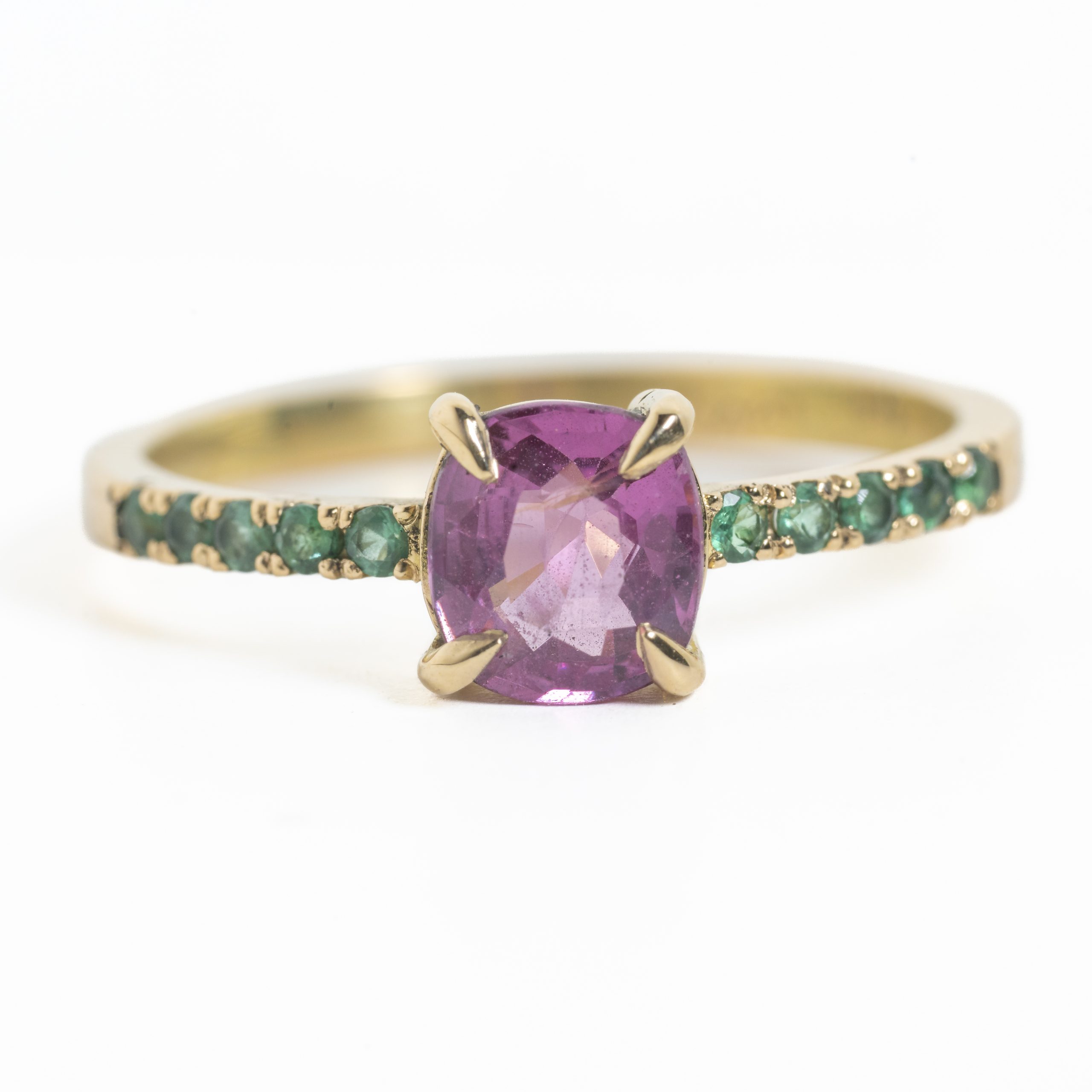 Anillo de oro de 18K con Espinela Rosa natural sin tratamiento (incluye certificado) talla cojín y 10 Esmeraldas talla brillante de 1,7mm.