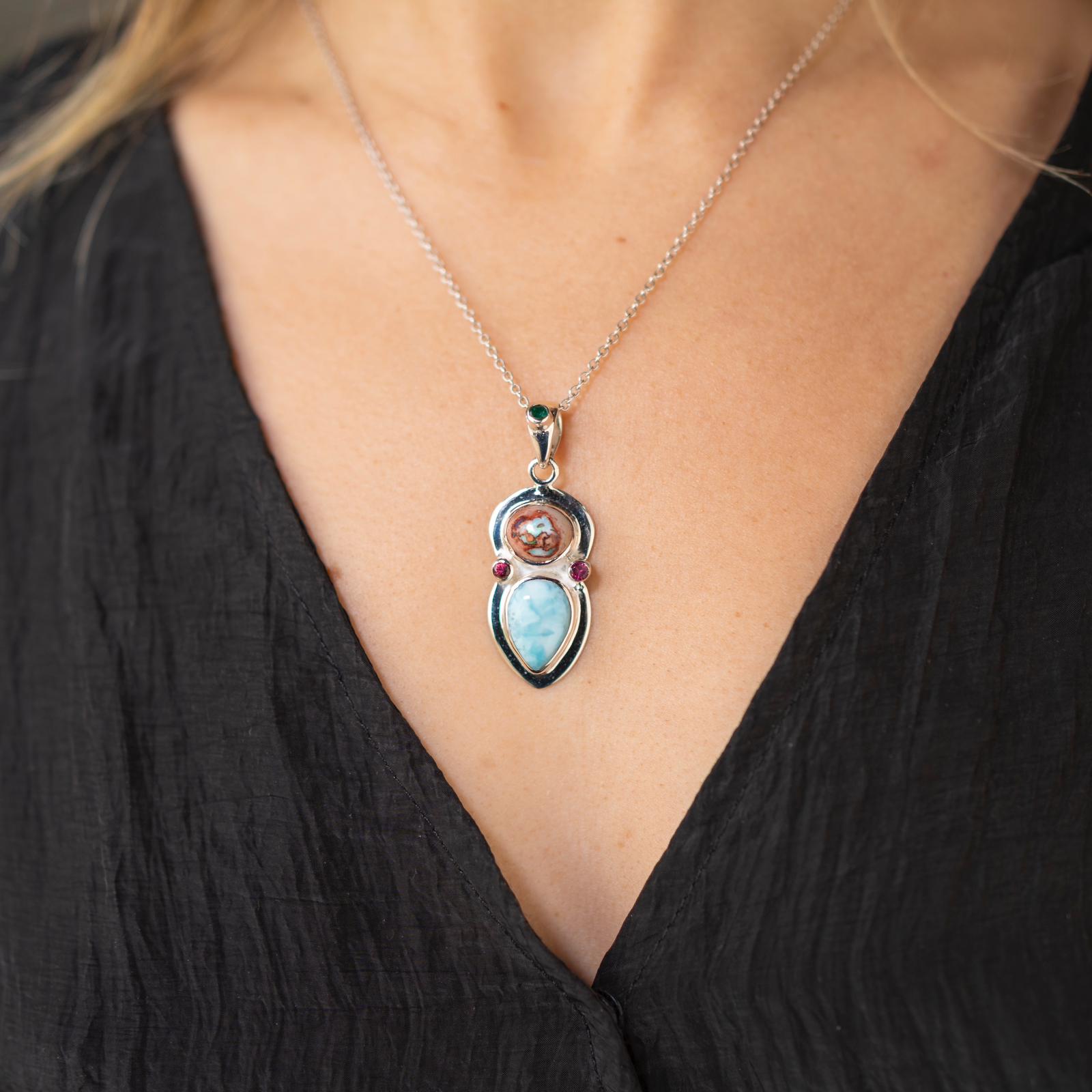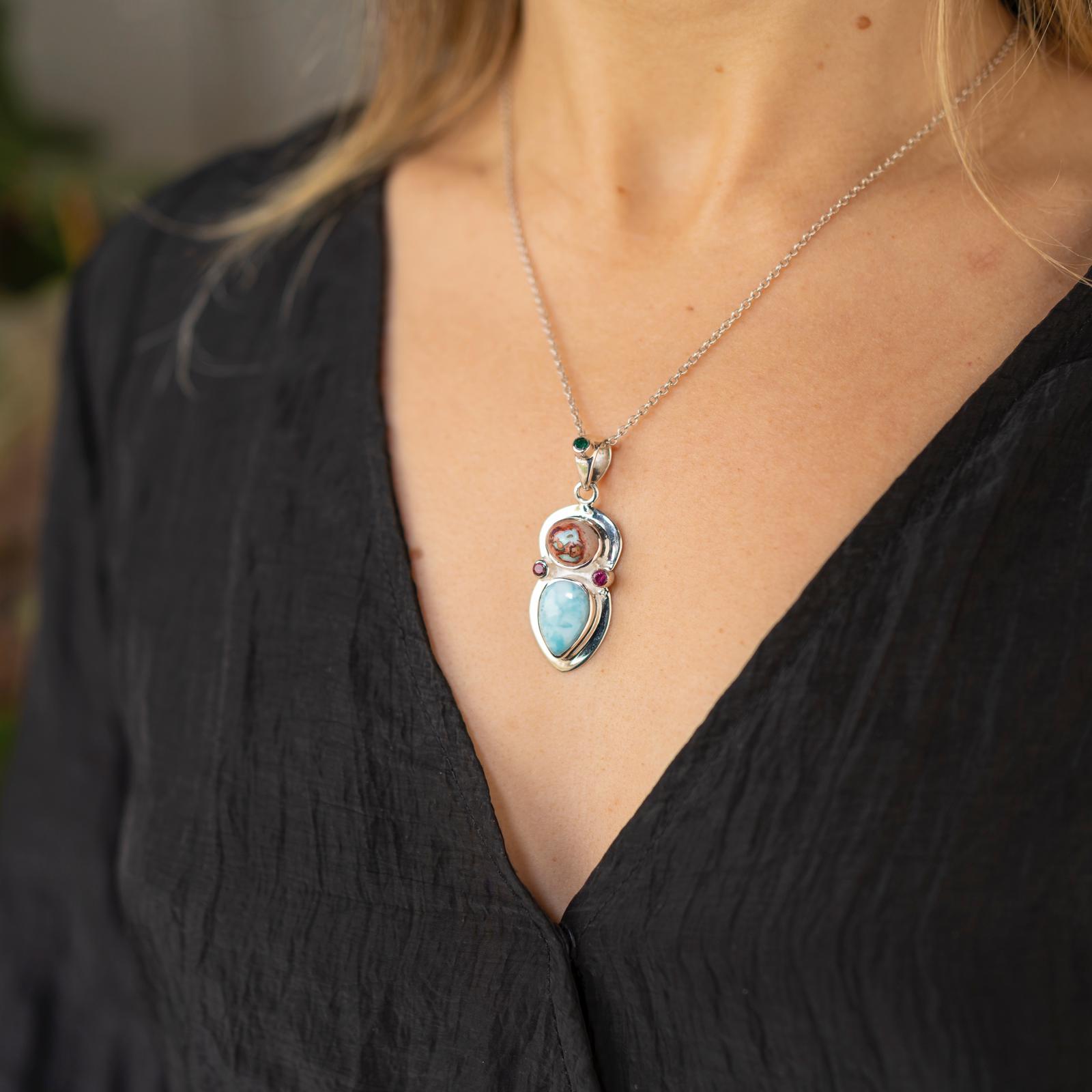 Colgante de plata 925 con Ópalo de Fuego mexicano, Larimar, dos Turmalinas Rosas y y Esmeralda talla brillante en el enganche .
