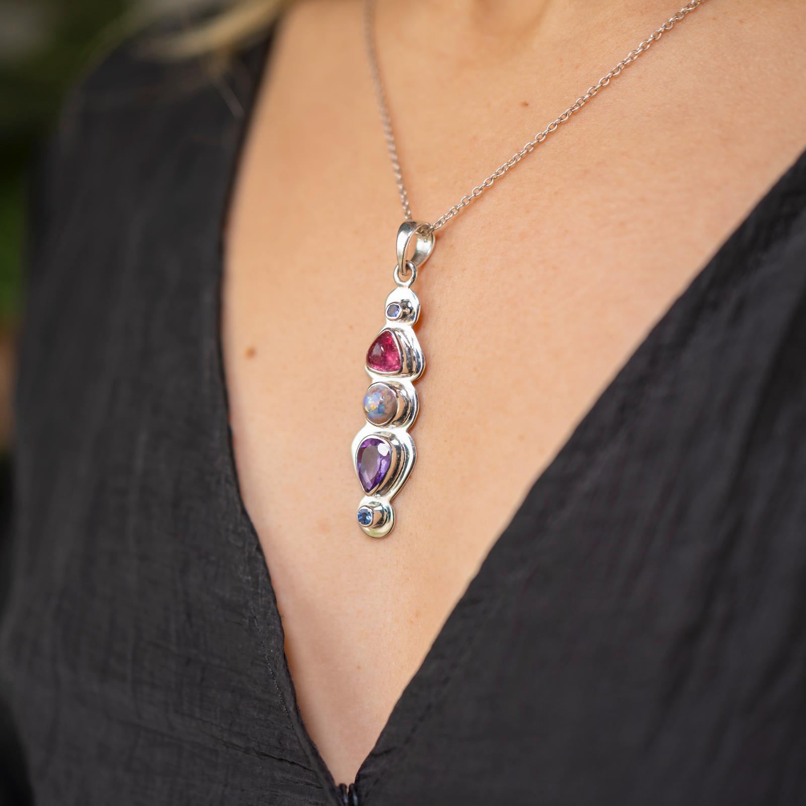Colgante de plata 925 con Turmalina Rosa, Ópalo de Fuego mexicano, Amatista y dos Zafiros Azules talla brillante.